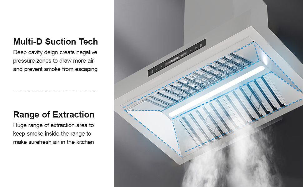 Adjustable Chimney Cover, Diswasher Safe Filters, Gesture Sensing Control