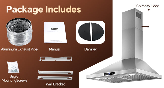 This vent hood 30 inch comes complete with everything you need for setup: aluminum exhaust pipe,manual,damper,bag of mounting screws,wall bracket.