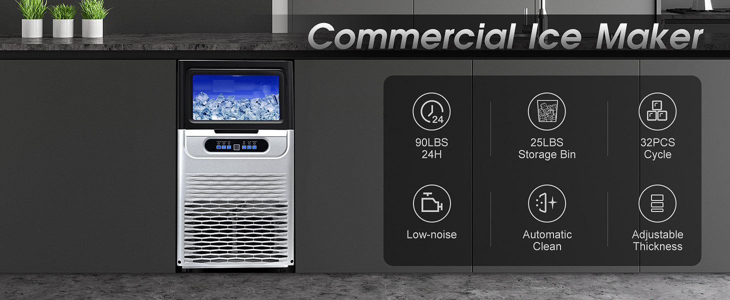 - 【High Production Rate】The professional commercial ice maker operates with an efficient powerful compressor for rapid ice making, which can quickly produce up to 10 to 18 minutes per cycle,90lbs of ice per day, ensuring a constant supply for your business or home. A suitable storage capacity of 25lbs makes this ice maker perfect for your home or party, don't have to worry about running out of ice during peak hours or parties.