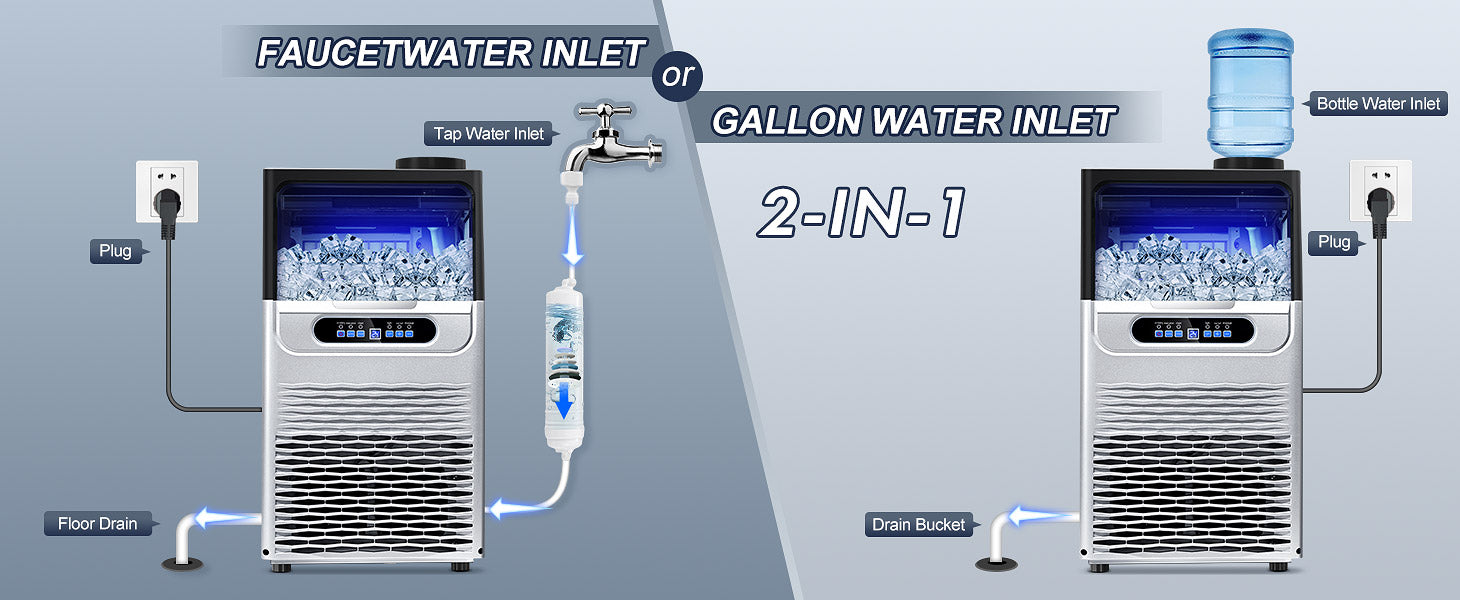 - 【Efficient, Quite and Energy-Saving】You can enjoy the experience of this commercial ice machine all the time. The powerful compressor allows the ice machine maker to complete the ice making process efficiently without causing too much noise. High efficiency and low noise provide you with a comfortable environment to enjoy your high-quality ice.