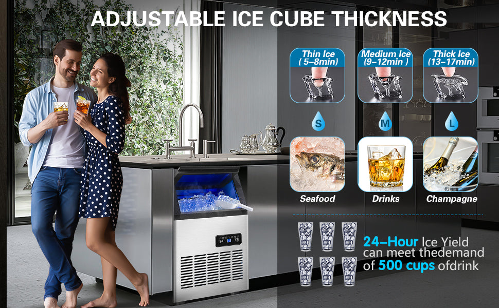 - 【Efficient, Quite and Energy-Saving】You can enjoy the experience of this commercial ice machine all the time. The powerful compressor allows the ice machine maker to complete the ice making process efficiently without causing too much noise. High efficiency and low noise provide you with a comfortable environment to enjoy your high-quality ice.