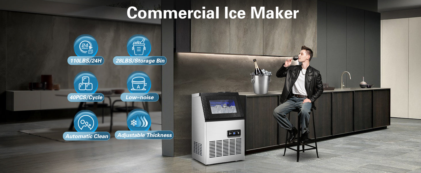 - 【High Production Rate】The professional commercial ice maker operates with an efficient powerful compressor for rapid ice making, which can quickly produce up to 10 to 18 minutes per cycle,110lbs of ice per day, ensuring a constant supply for your business or home. A suitable storage capacity of 28lbs makes this ice maker perfect for your home or party, don't have to worry about running out of ice during peak hours or parties.