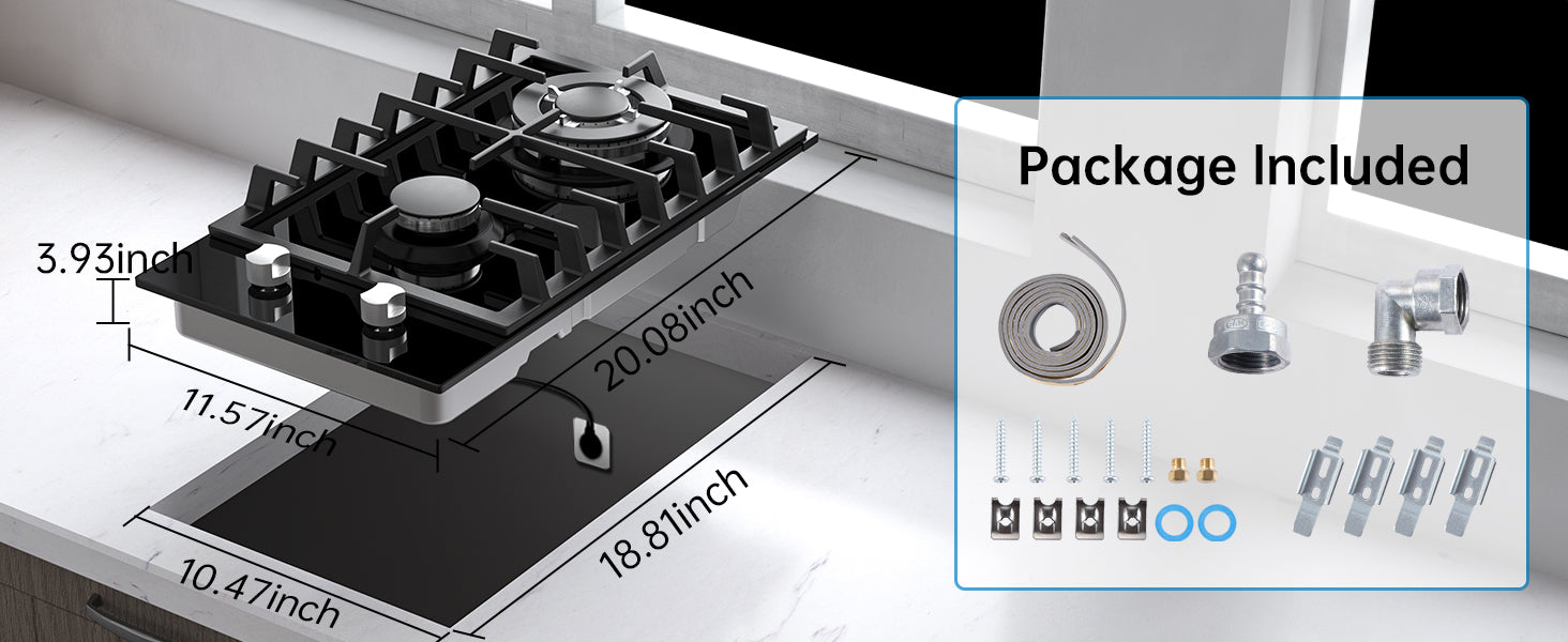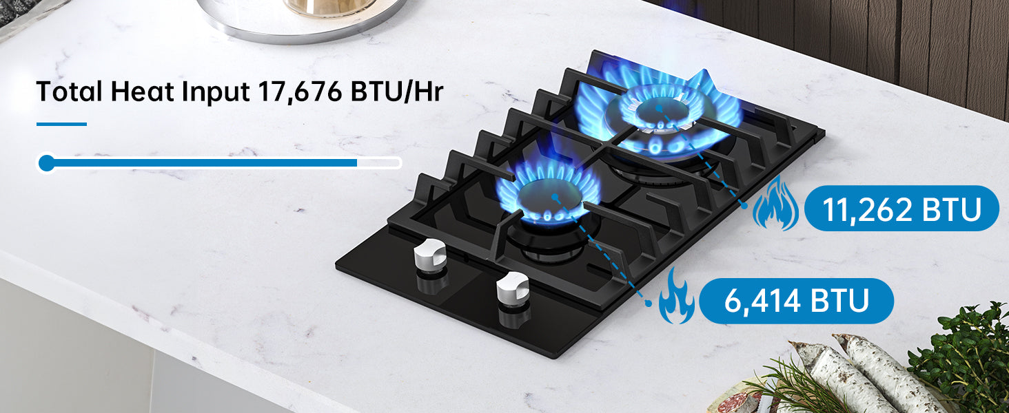 - Highly Efficient Burners:12 inch gas cooktop features 2 highly efficient sealed burners. 11,262 BTU and 6,414 BTU