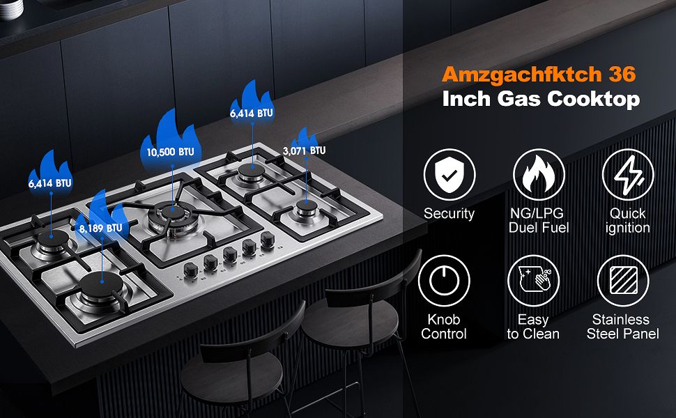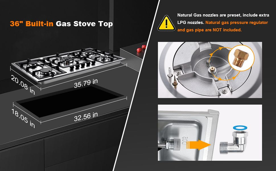 GH002-365S - 36 inch - 5 Burners Gas Stove Top, Built in Stainless Steel 36 Inch Gas Hob with LPG/NG Convertible Propane Cooktop