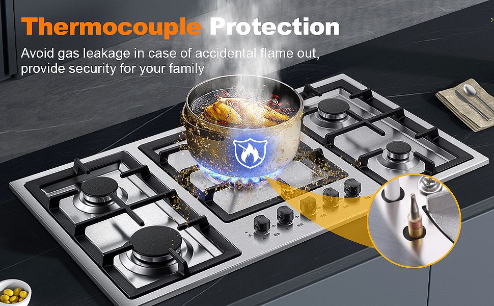 The 5 high quality burners always provide full combustion and stable flame,ensuring that every corner of the pan gets even heat and preventing energy loss. Each burner operates independently and can cook multiple dishes at the same time, helping you create delicious and nutritious meals.
