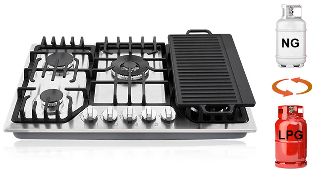 - LPG/NG Convertible: Product dimensions: 29.92 in. L x 20.08 in. W x 4.53 in. H | Cutout dimensions: 28.94 in. L x 19.09 in. W. This dual fuel gas stovetop is designed for natural gas and liquid propane. The initial setting is for natural gas, come with both natural gas & propane nozzles.