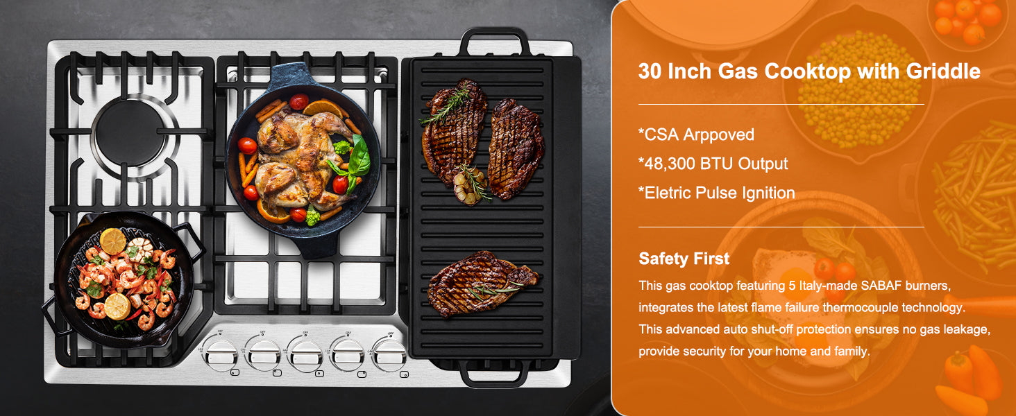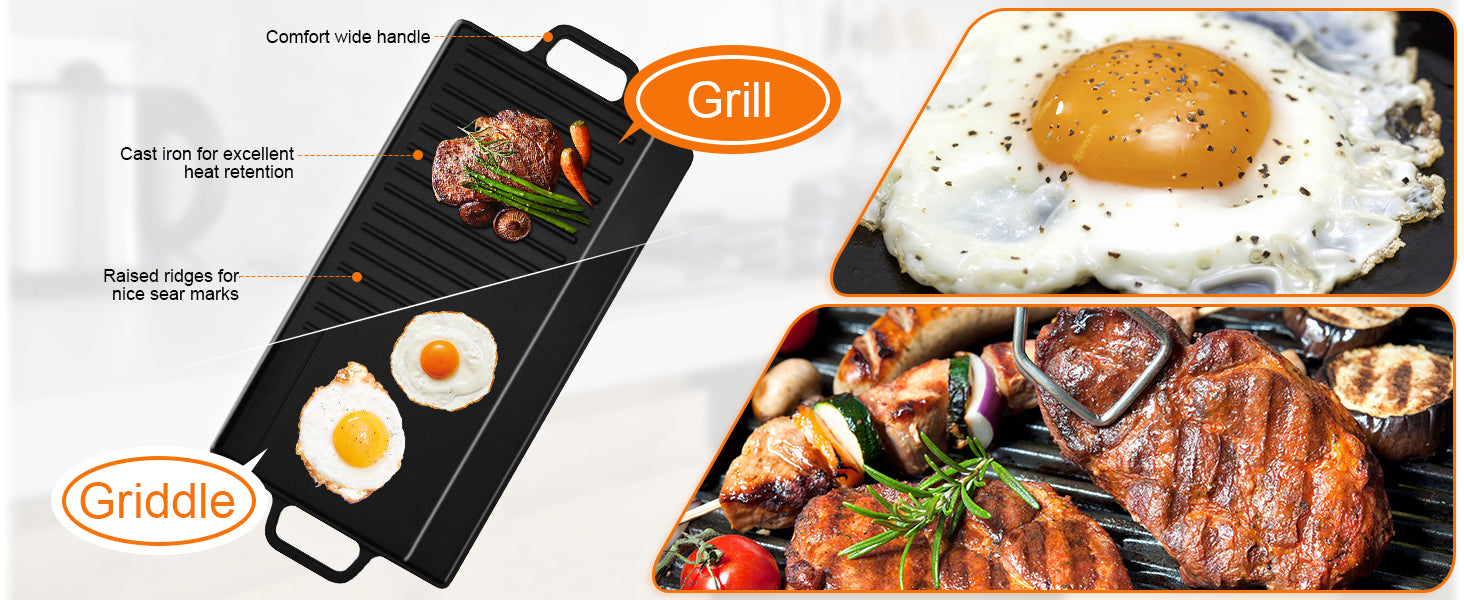 - 2-in-1 Reversible Grill & Griddle: This gas cooktop's griddle made from heavy-duty cast iron, this griddle is built to last and maintain its high-quality. Cook a variety of meals on this reversible griddle/grill. On the smooth side, cook eggs, pancakes and bacon. On the ridged side, grill steaks, burgers, and veggies!Comfortable wide handle for easy-grip.