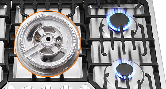 - 20,000 BTU Powerful Versatile Tri-ring SABAF Burner: 30 inch gas cooktop features 5 Italy SABAF highly efficient sealed burners. [20,000 BTUs + 10,300 BTUs + 4000 BTUs + 7000 BTUs + 7000 BTUs.