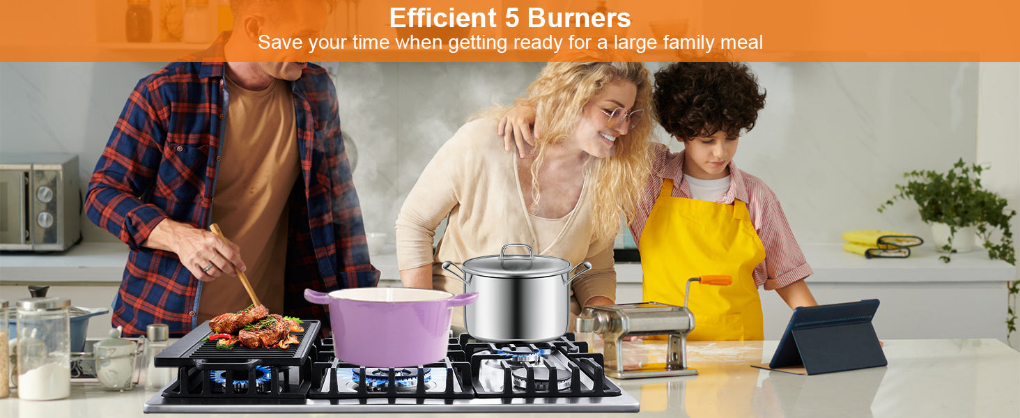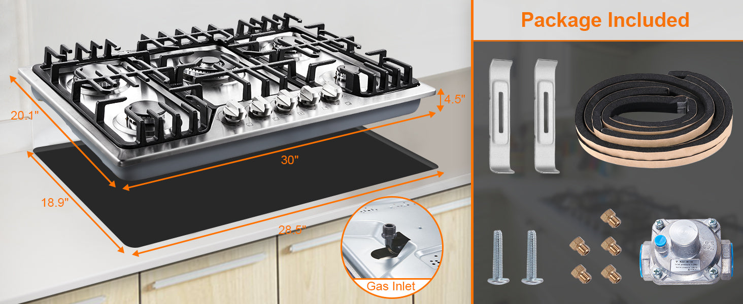 - Preium Quality & Easy to Clean: This 30 inch gas range top is built with 304 food-grade stainless steel surface and durable parts including edge to edge heavy cast iron grates and heat resistant metal knobs.