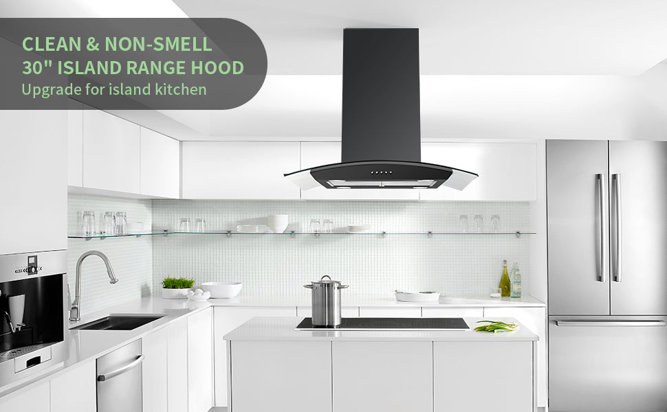 Volume of cooking area is 10 cubic feet, we up grade the airflow capacity to 900 CFM to keep it fresh every second. For island range hood, large airflow capacity is necessary.
