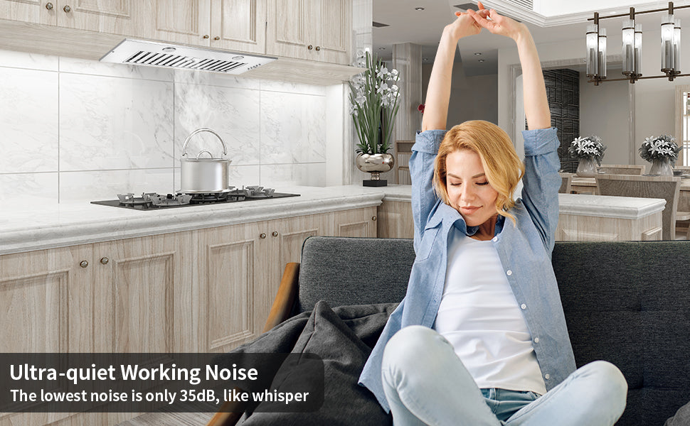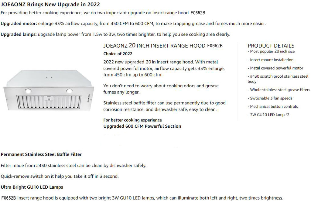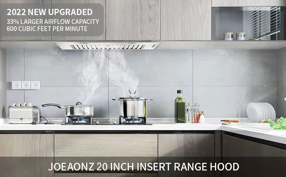 【Heavy-Duty Cooking】Built in range hood 20 inch comes with the powerful and ultra-quiet blower system, which can make your kitchen hood reach 600 Cubic Feet Per Minute and control noise level does not exceed 60db even at the highest speed. Remove harmful grease and odor, make your enjoy your cooking anytime【Deep-Groove Baffle Filter】The insert range hood comes with a durable and easy clean stainless steel grease filter, which is designs with deep grooves to catch grease before they drip down on your cabinets, countertops, walls, and floors, and also can throw them into your dishwasher and come back later