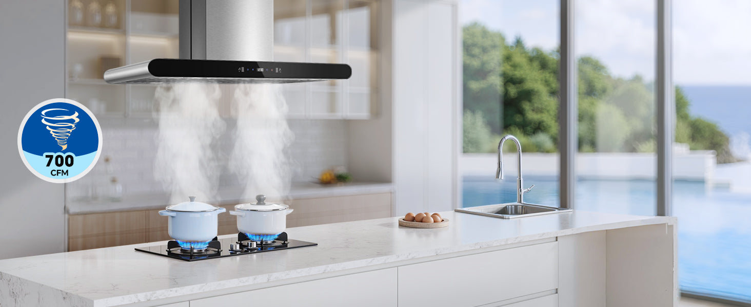 【700 CFM Powerful & Quiet】Island range hood delivers robust 700 CFM suction with 3-speed settings, efficiently clearing smoke and odors while operating at a quiet ≤65 dB.