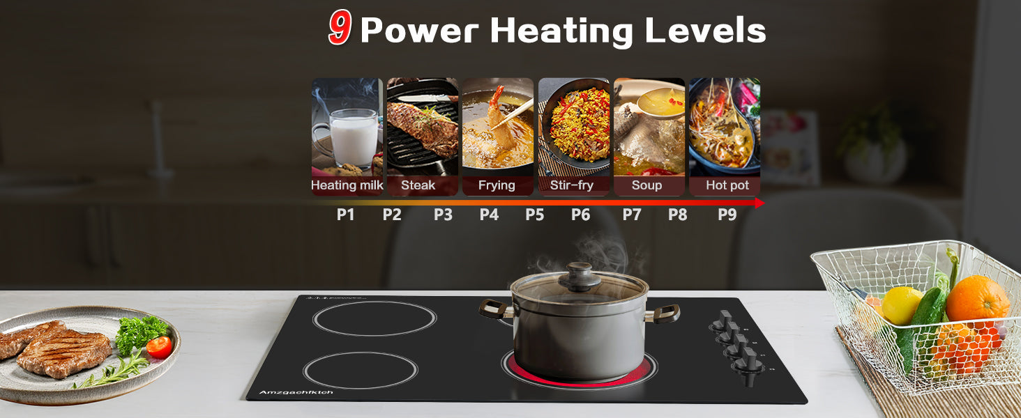 - 【Elderly-Friendly Knob Control】This 4-burner electric cooktop features intuitive knob controls, perfect for seniors or those with limited eyesight. Easily adjust 9 precise power levels for frying, steaming, or boiling.