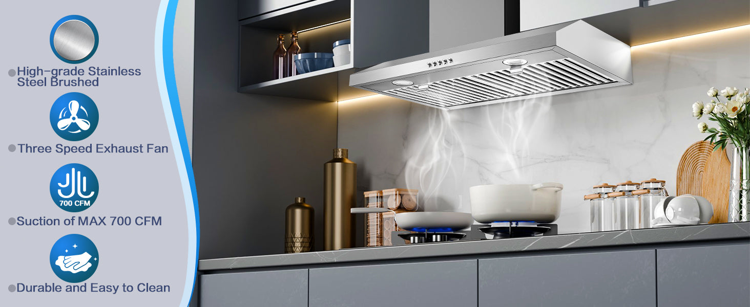 Equiped with 3-speed exhaust fan and MAX airflow of 700 cfm, easily meet various cooking needs and keep air clean.
