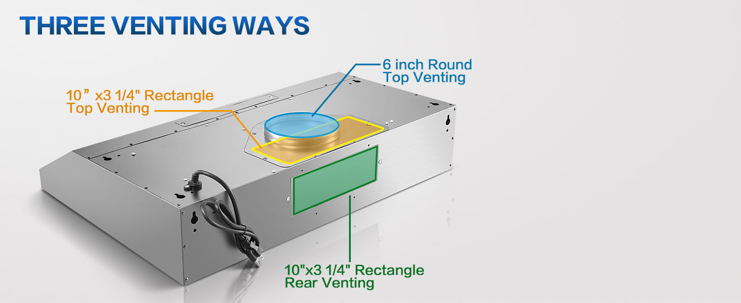 - 【Vent Hood with 3 Exhaust Ways】This stove hood vent has 3 venting outlet for optional,6 inch TOP round outlet,10x3 1/4 inch TOP rectangle outlet and 10x3 1/4 inch REAR rectangle outlet,suitable for installation of top ducted or rear ducted.Please check whether this kitchen exhaust hood matches your existing exhaust duct before purchasing or installing.