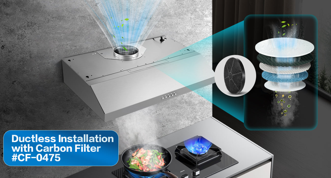 - 【Ductless Range Hood Convertible to Ducted】The kitchen hood can be for ducted/ductless used.Just install a carbon filter to convert it to indoor recirculation,part #CF-0475(NOT included & need to purchase separately).To ensure adsorption efficiency of the carbon filter,it is suggested to change this part about every 3months base on the kitchen actual condition.