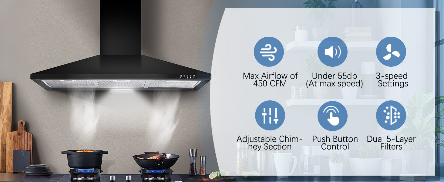 【Powerful 450CFM Ventilation】3-speed motor efficiently removes smoke, grease, and odors. Crafted from glossy black stainless steel for modern style and durability.