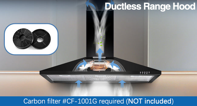 In ductless range hood mode, converting it to a ductless range hood just by installing a set of canbon filters #CF-1001G(NOT included, sold separately).