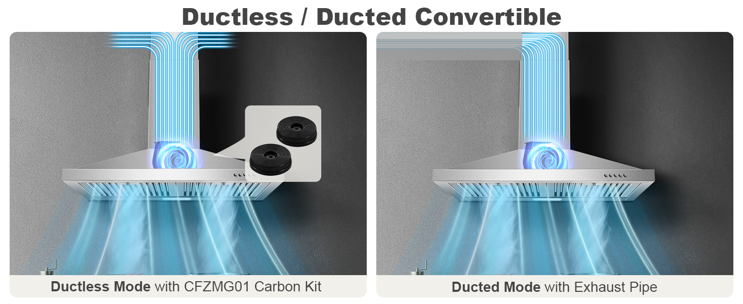 - Ductless Mode: The 30 inch vent hood can be converted to ductless mode with CFZMG01 carbon filter (sold separately), which make the clean air released back into the kitchen.