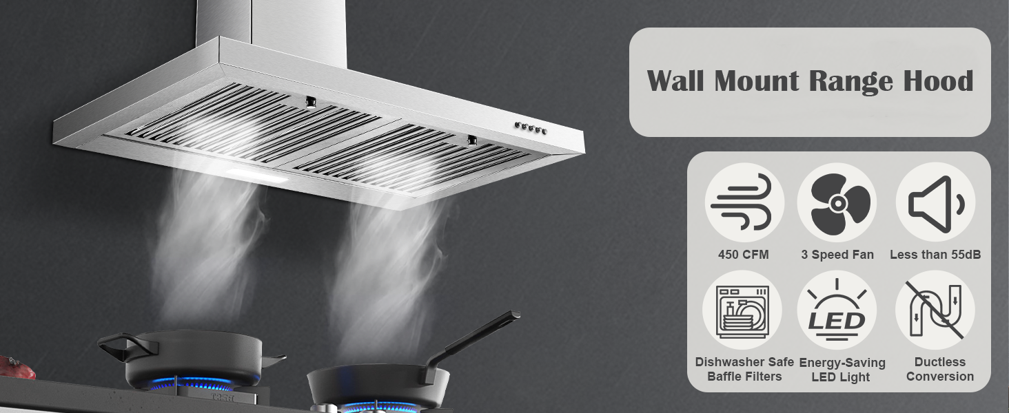 With the 450 CFM strong suction, this wall mount range hood can prevent the cooking fumes from spreading.